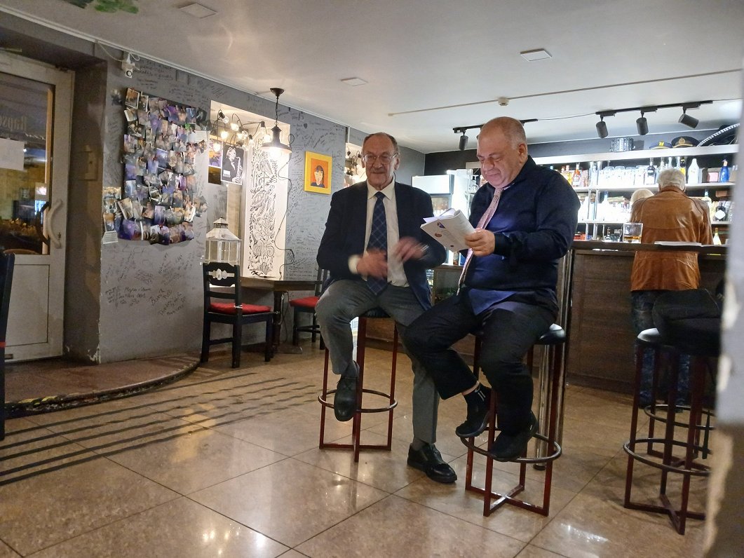 Среди гостей нынешнего вечера были переводчица и поэт Милена Макарова, писатель Улья Нова, высоко оценившие презентованную нашей публике последнюю по времени книгу «Позвонила тётя Ида», которая выпущена в Киеве отдельными изданиями на русском и украинском языках. Эта книга уже была представлена в родном для господина Гальпера Киеве (он родился в украинской столице в 1971 году и прожил в ней до эмиграции в США в 1989-м), а также в Вильнюсе. Издание отлично оформлено действительно весьма известной художницей Зоей Черкасской, которая также родом из Киева и с 1991-го живет в Израиле, где работает в жанре гротеска и чёрного юмора.