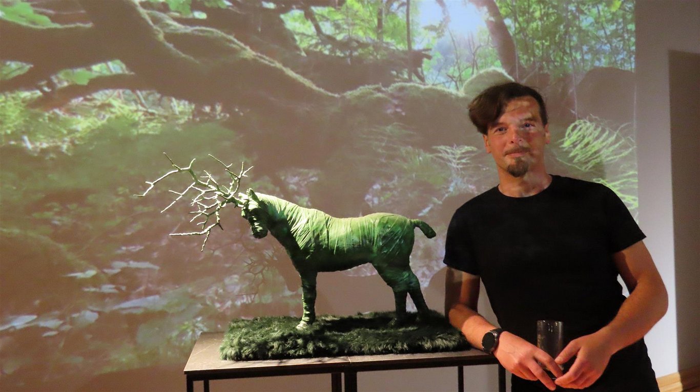 По углам зала представлены четыре мифических коня, все — вариации на тему «Призрака лошади», Эгон Першевиц когда-то создал его для Даугавпилсской крепости. Он эту работу очень любит и постоянно обыгрывает, придумывая всё новые и новые ипостаси. Кентавра, он же «Полковник Фридрих Бриедис», и Единорога с ветвистым рогом, что твое вишневое деревце в одной из баек Мюнхгаузена, тоже можно было увидеть в Кулдиге. Сейчас Единорог красуется на фоне видео с дубами в лесу, его специально для этой выставки сделала наша коллега Инга Озола с Латвийского радио 1. Забегая вперед — именно рядом с Единорогом Эгон захотел сфотографироваться, а на замечание, что блики от видео ложатся на лицо, возразил, что так даже лучше.
