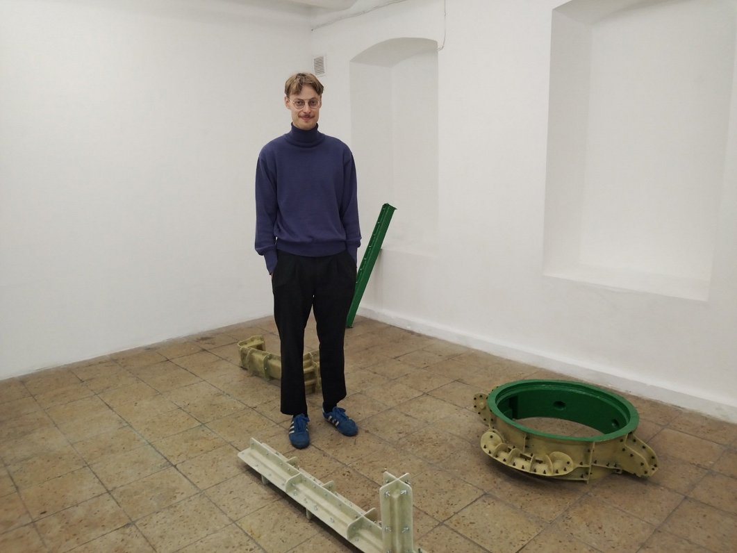 Перед нами представленное в рамках Рижской квадриеннале скульптуры творчество 24-летнего студента ЛАХ Кришьяниса Белявскиса — экспозиция под странным названием SBLNTPKSBD. Экспонаты размещены не на стенах, а на полу, они представляют из себя нечто, отдаленно похожее на строительные элементы. По счастью, рядом оказался и автор, который, как мог, пояснил, к чему все это.
