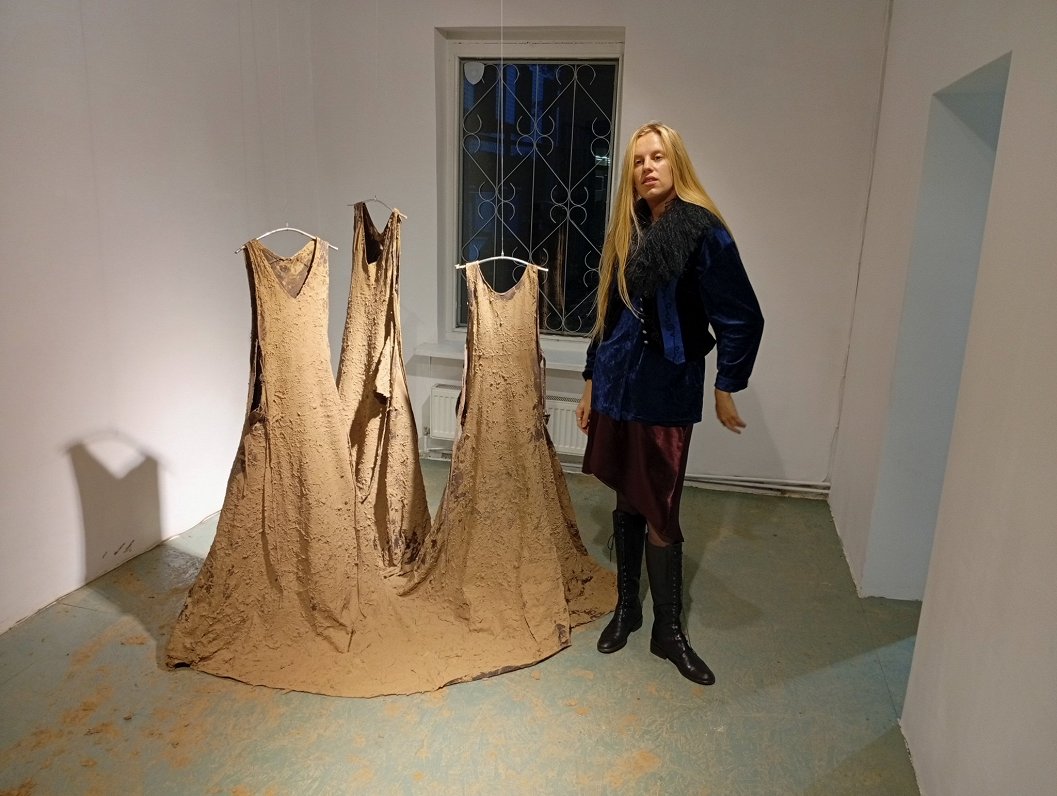 Кроме того, здесь ещё и фотографии, нанесённые на стекло. А также культурный объект, олицетворяющий раздевалку, сделанный из той же кожи, которой обтянуты кости несчастного животного. И вывешены «грязевые платья» из той же кожи — так сказать, из подручных средств.