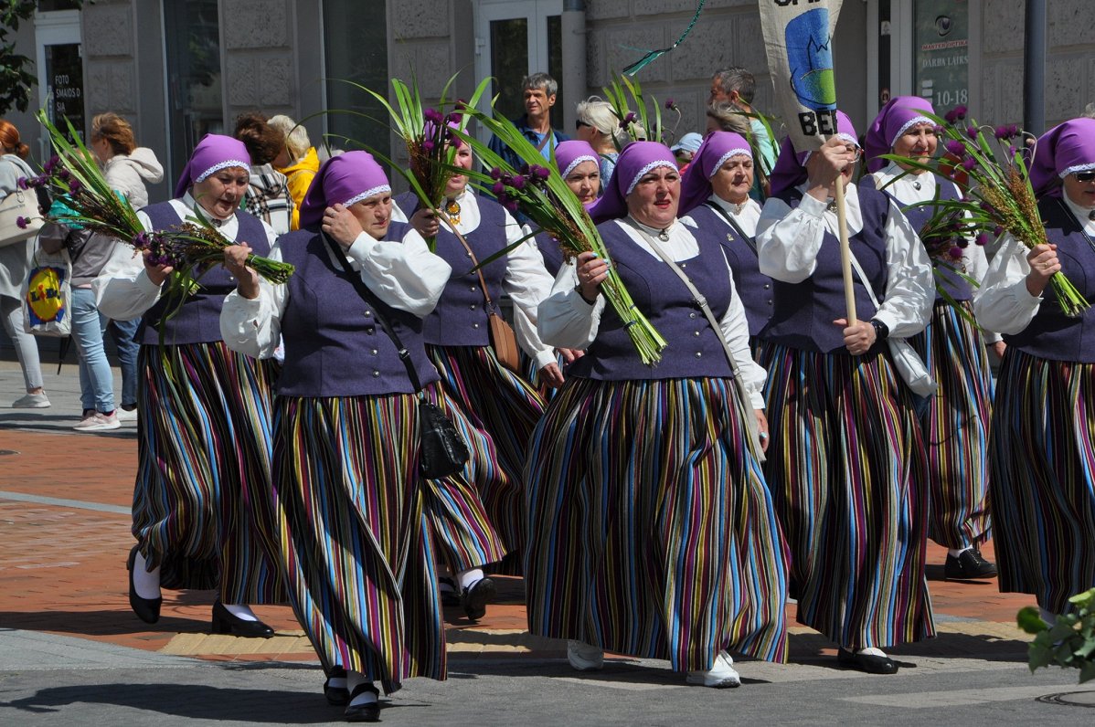 Затем все участники выстроились в колонну и прошествовали по традиционному даугавпилсскому маршруту — от железнодорожного вокзала по улице Ригас до площади Виенибас. На площади ко всем обратился председатель Даугавпилсской городской думы Андрей Элксниньш, и затем состоялась короткая спевка, объединившая участников из всех регионов Латвии — Видземе, Земгале, Курземе, Латгале, Селии и Риги, а также гостей из Литвы, Эстонии, Украины, Перу и Великобритании (последние представляли латышский фольклор давно живущих на берегах туманного Альбиона латвийцев — LSM+).