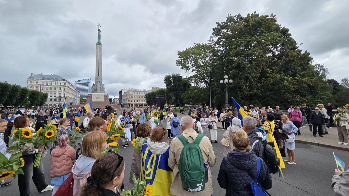 У многих собравшихся в руках были подсолнухи. Некоторые также взяли с собой флаги Украины и Латвии или накрыли плечи украинским флагом.