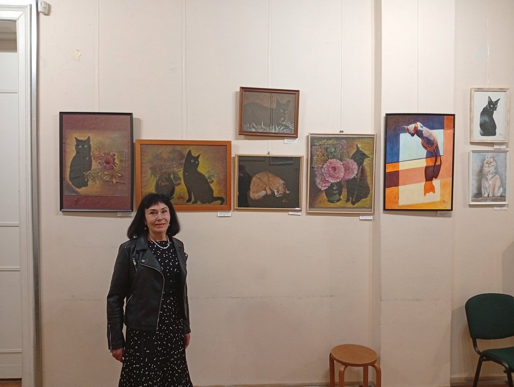 «Выставка называется “Источники моего вдохновения”, — рассказала в беседе с LSM+ госпожа Сундеева. — И они изображены на картинах — котики, природа, родная Юрмала, цветы и люди. Хотя людей тут мало представлено, но портреты есть. Но для начала — животные. Помимо котиков, я и собачек рисую. А цветы… Ой, пионы очень люблю, люпины, маки, полевые цветы. А портреты… Когда мы жили в Берлине, с супругом ходили в джаз-клуб, и там музыкантов я просто зарисовала — несколько таких акварельных работ. Но портреты я и маслом тоже делала в последнее время. А котики, кстати, — это техника пастели на мятой бумаге».