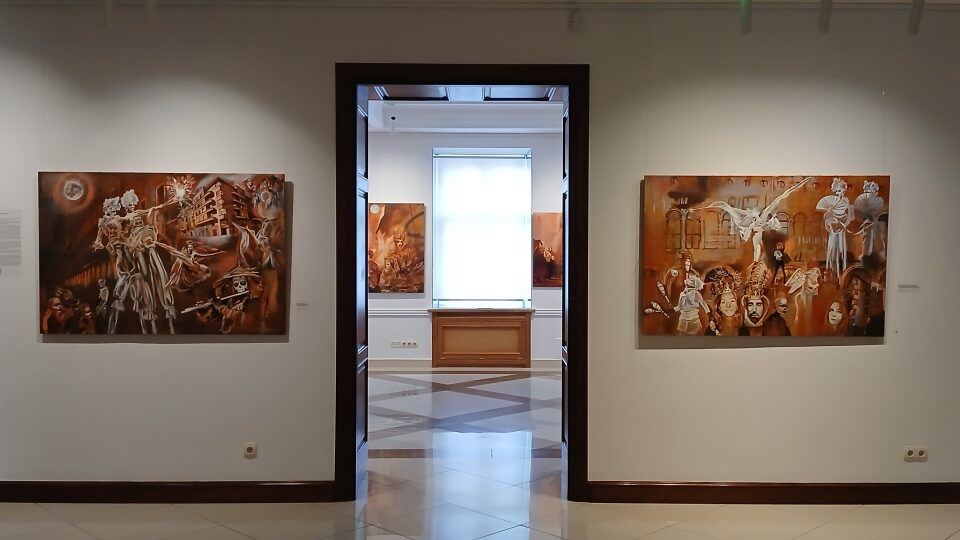 Большие, можно даже сказать, местами масштабные живописные полотна, на которых маскарады, ангелы и демоны, звёздное небо и множество других объектов и героев. И всё это с обильным налётом итальянского настроения и венецианского карнавала.