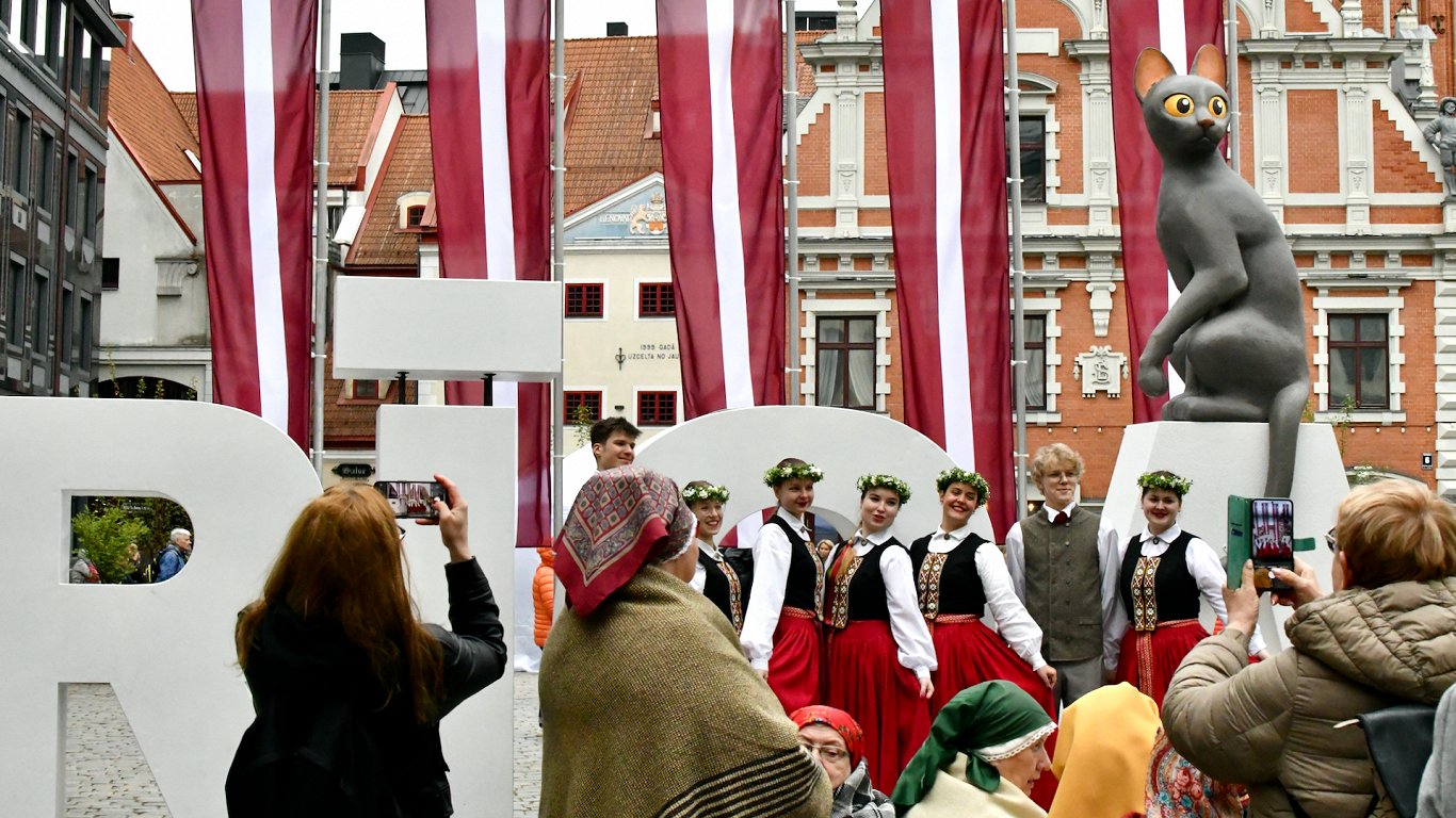 У Сейма тоже собирается народ, здесь сегодня чествуют участников исторического заседания, в 1990 голосовавших за независимость Латвии. По случаю торжеств открыт и главный вход в Латвийский парламент. На флагштоках готовятся поднять флаги трех стран Балтии и флаг Украины. Установлены экраны и стенды выставки, готовятся к выступлению хоры, собрались сотни людей.