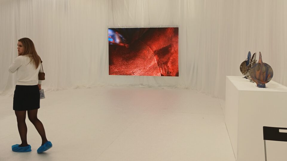 Полупрозрачные «клетки» из белоснежной материи разделяют пространство на множество камерных залов. В своем творчестве автор использует и преобразует материалы, тесно связанные с миром природы, такие как масла, песок и глина. Ее холсты включают в себя кусочки краски, латекса и других искусственных, но похожих на кожу материалов. Поверхность ее картин покрыта густыми пастозными мазками — это своего рода живопись действия, напоминающая о ритуальных или церемониальных практиках.