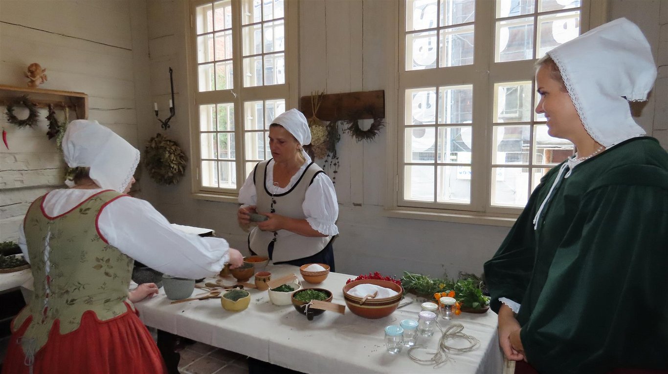 На первом этаже большой стол был весь в охапках разнообразной сушеной травы, тут же ступки, пестики, мешочки и баночки — здесь «командовала парадом» сотрудница музея Винета Соловьева, под ее чутким руководством можно было сделать смеси пряностей и травяные мешочки для сна. «Какой запах!..», — восхищалась милая дама, уткнувшись носом в мешочек с травами…