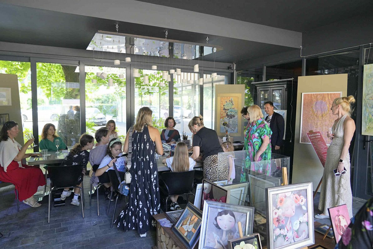 «Наш проект становится всё более международным, в нём участвуют художники из десяти стран. И сейчас некоторые из них представили своё творчество в этой галерее, которая предоставлена нам благодаря спонсорской поддержке со стороны Ассоциации семей Балтии. Галерея небольшая, зато в самом сердце курорта! В прошлый раз у нас было мероприятие большое, в Доме культуры “ВЭФ”, там были, конечно, все наши участники. А сейчас у нас в Юрмале двадцать авторов, картины, скульптуры и платья, которые они расписали для нашего проекта».