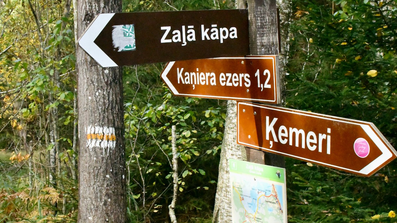 От железнодорожной станции Кемери до начала тропы пешком минут 15-20. Информационный стенд есть рядом со станцией, а далее указатели проводят до стартовой точки маршрута. Идем (или едем) улице Броценю (Broceņu), далее налево по Партизану (Partizanu), которая упирается в небольшую автостоянку у начала маркированной тропы.