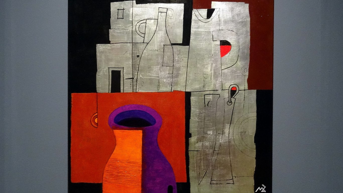 изображает собственный мир, сконструированный из узнаваемых объектов вперемежку с геометрическими фигурами,