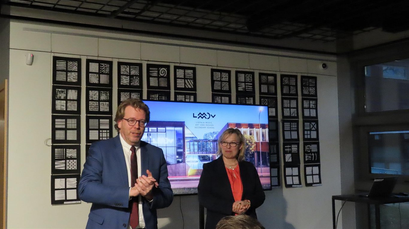…Посол Германии Гудрун Маслох (Gudrun Masloch), посол Франции Мануэль Лафон Рапнуй (М. Manuel Lafont Rapnouil), директор института Гете Ульрика Вурц (Ulrike Würz) и директор Института Франции в Латвии Матье Лепорини (Mathieu Leporini) с удовольствием слушали выступление джазового трио воспитанников Лиепайского колледжа музыки, искусства и дизайна. Визуальный оформлением служила выставка работ студентов «Дизайн продуктов».
