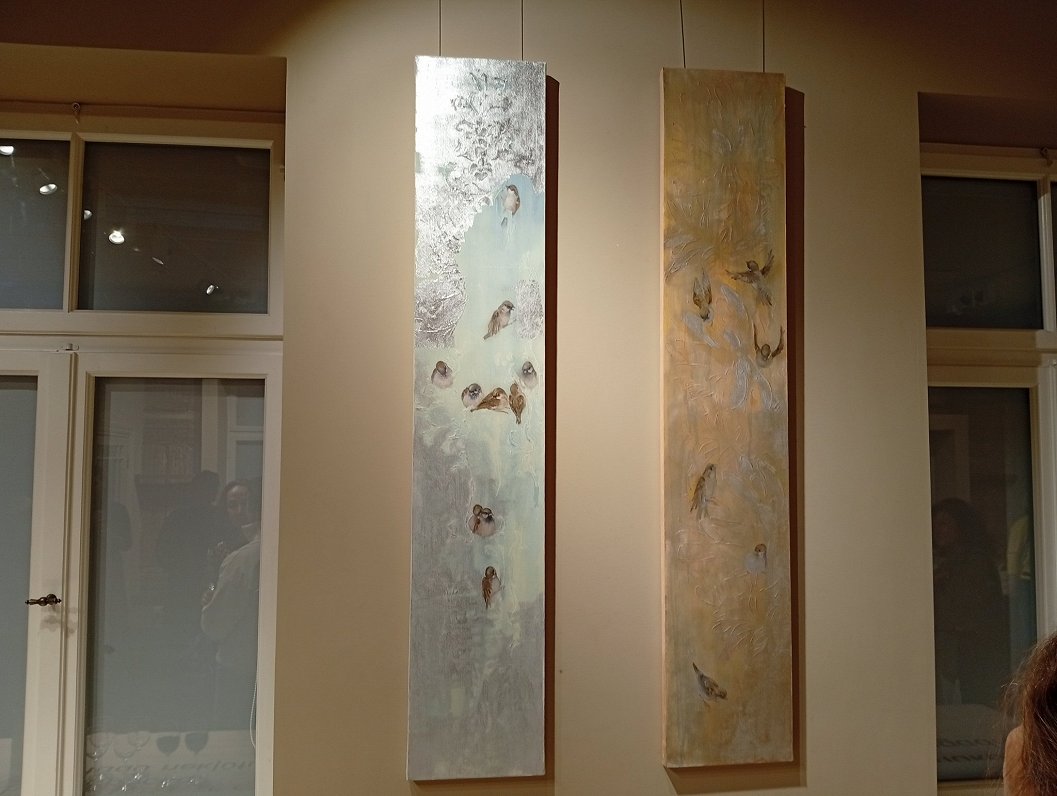 Кроме того, здесь еще есть и позолоченные картины с воробьями, которые несколько лет назад можно было увидеть в мемориальном музее поэта Александра Чака в рамков моей персональной выставки “Городские ангелы. Чак”. Так что от Чака — к Райнису. У Райниса, как и у Чака, — это создания на уровне земли и на уровне неба. У Райниса очень выражен в творчестве духовный уровень, поэтому у него и птицы. Если взглянуть на это с точки зрения мифологии, религии и так далее, то во всех религиях птицы в некотором роде являются посланниками между мирским и духовным».