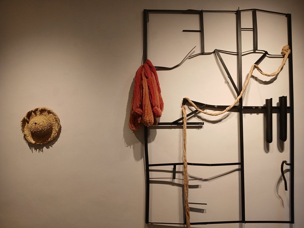 Экспозиция названа «Она созерцает пламенную природу вещей». И даже в элегантной соломенной шляпке («Шляпка лодочника»), повешенной на стене, можно лицезреть пламя. На самом деле это художественный и весьма виртуозный обман: на первый взгляд, перед нами лёгкая соломенная шляпка, а в действительности это керамика, которая весит несколько килограммов. Работа проделала перед этим путь, как и положено, через обжиг глины.
