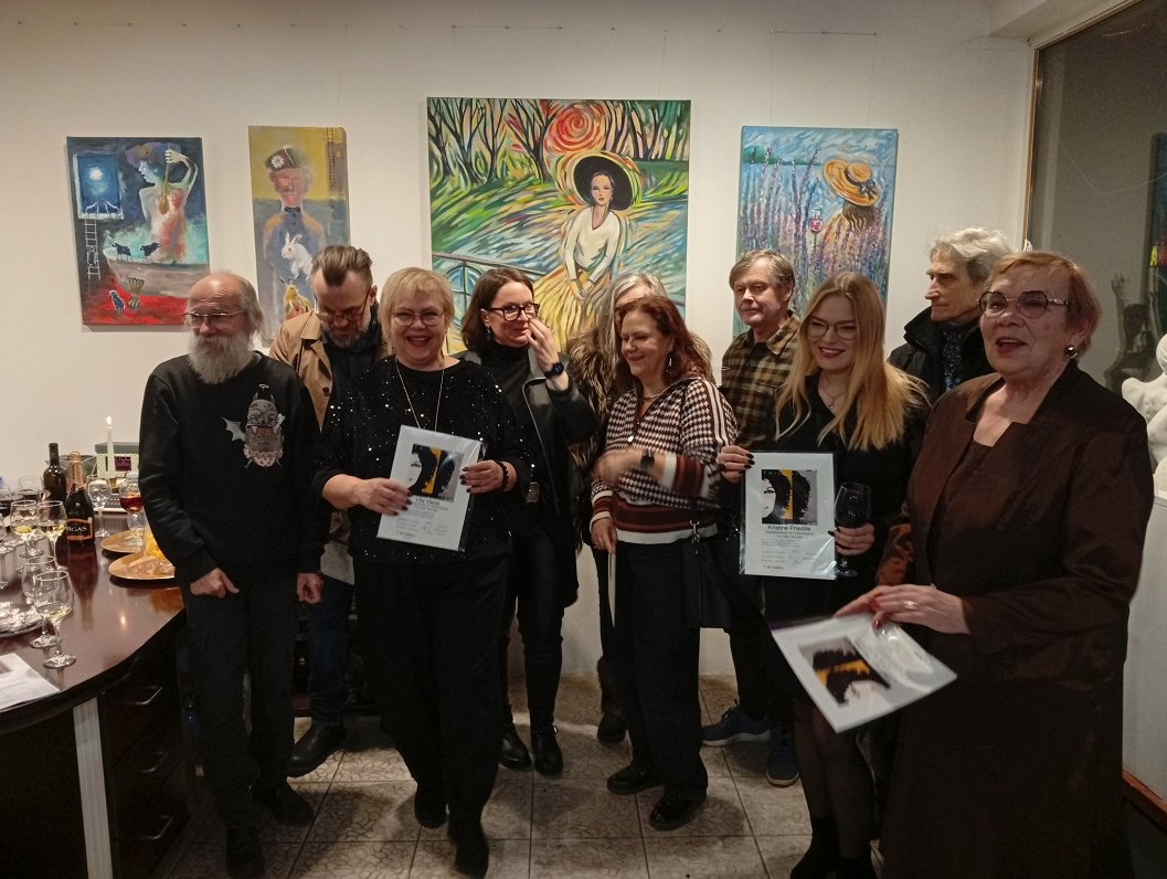 Вот эта великолепная компания, представители разных национальностей — латыши, русские, белоруска: Рита Пранча (на фоне ее работы все участники и сфотографировались на память для LSM+), Николай Кривошеин, Дзинтар Калнин (именно так, не Калниньш!), Надежда Изенева, Илзе Лайзане, Дайга Ванага, Вита Виесе, Владимир Павлов и сама Vera Vart.