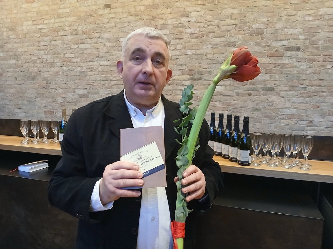 Далее юбиляр поздравил литературного редактора и корректора книги, художницу издания Иеву Юрьяне. А также коллегу, актрису Байбу Броку, которая также 7 января отмечала день рождения. И откупорил настоящее французское шампанское с эксклюзивной надписью Ak, šī plaisa, sasodītā plaisa! Пользуясь случаем, LSM+ поздравил артиста и немного побеседовал с ним.