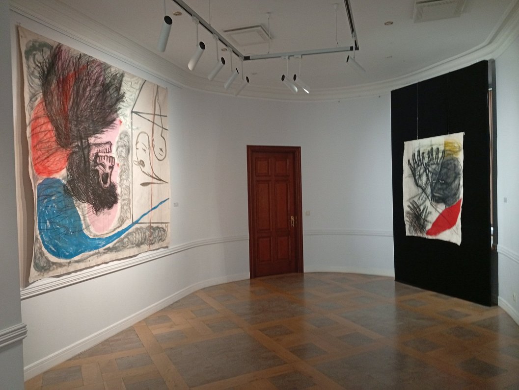 Мои работы не обрамлены, но можно сказать, что это живопись на холсте, хотя вообще здесь и очень много угля, мела, пигмента. И было решение их не обрамлять. Конечно, не проблема было сделать рамки, но захотелось их так оставить».