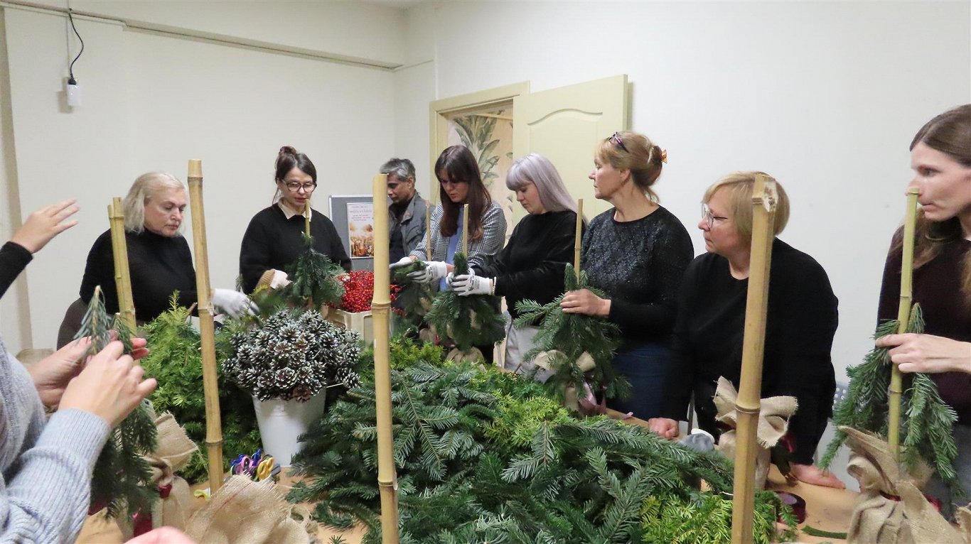 …В помещении для разных занятий в Patvērums ģimenei было шумно — больше десятка человек по руководством флориста, хозяйки цветочной мастерской Afrīna Агнесе Миахи создавали рождественскую композицию — стол был завален хвойными ветками и прочим материалом и каждая из участниц создавала свое дерево.
