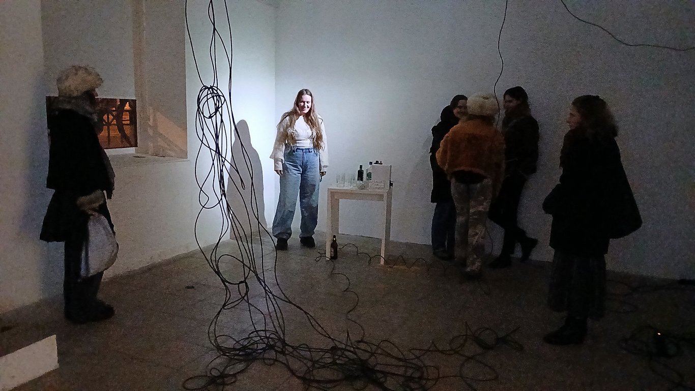 Клубки проводов символизируют технологические сети, от которых мы зависим. А также и клубки эмоций в отношениях с различными людьми. Попробуем этот клубок немного распутать? Собственно, во время открытия участники это и попытались проделать, неспешно распутывая узлы. С каждым развязанным узлом в самой темной и дальней части пространства галереи загорается маленький огонек. Перед нами — прояснение! Да будет свет!