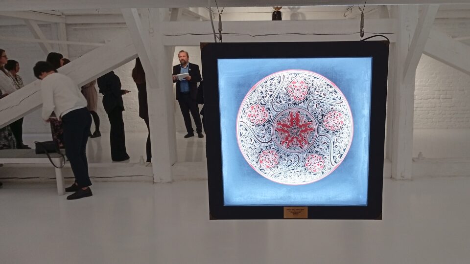 Qalqan (калкан) – круглый боевой щит, традиционно используемый в крымскотатарском вооружении. Рустем Скибин переносит эту форму в современную керамику, сохраняя семантику исторических знаков. 12 керамических щитов, представленных на выставке, выполнены в оригинальной авторской технике Quru Isar, отсылающей к древним образцам орнамента, которые художник открыл, внимательно изучая татарское оружие и доспехи. Каждое произведение имеет конкретный исторический прототип – шлем, меч, седло, ножны для ножа, доспехи, ремень, щит.