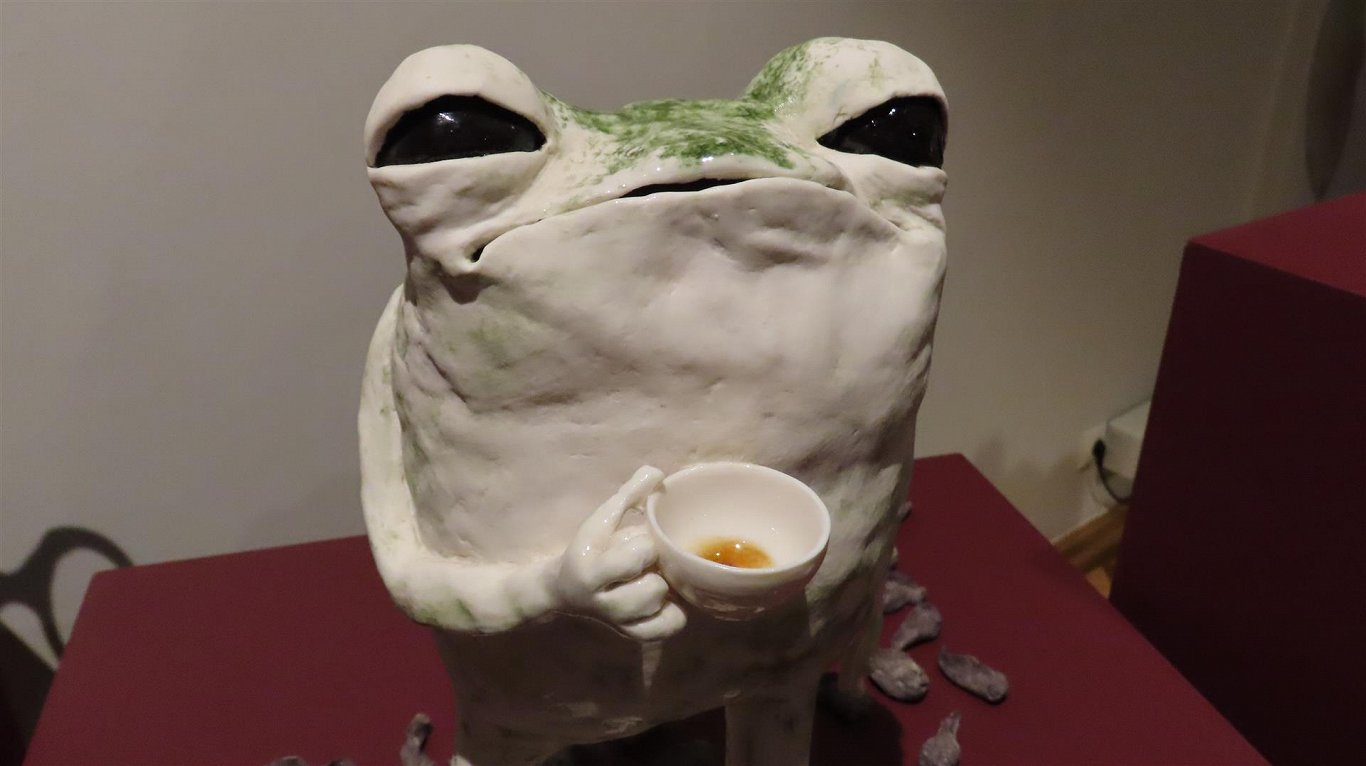 …На входе в первый зал анфилады вас встречает лежбище пухленьких тюленей — это «Остров Роню». А вот «Тайна» — надколотое яйцо с золотым обрамлением. Рядом — слегка замученная и заспанная лягушка с чашечкой кофе. Вокруг ее лапок, обутых к зеленые кроксы, снует множество головастиков. Это «Утро», а главная героиня, судя по всему, замученная бытом мамочка. Признаться, в эту лягушечку автор LSM+ буквально влюбился. Но в целом — в трех залах представлены больше трех десятков творений керамистов Латвии, Литвы и Эстонии, и каждая из них прекрасна! Разные техники и материалы — каменная масса, фарфор, глина, всякие глазури… И — свое послание. К примеру, одна стена завешана тарелками и осколками. Эта работа и называется «Осколки». Присмотритесь к росписи — на ней тоже разные разбитые чашки-вазы и всё это напоминает о погибшей цивилизации и ее обломках в археологических раскопах. Дальше, в третьем зале, есть несколько творений, явно вдохновленных древними культурами Южной Америки, а одна — нарочито грубо слепленная голова — буквально отсылка к заре человечества. Впрочем, я не настаиваю, у каждого посетителя этой изумительной выставки наверняка будут свои ассоциации. Главное тут — не пробежать по залам, а медленно прогуляться, наслаждаясь разнообразием.