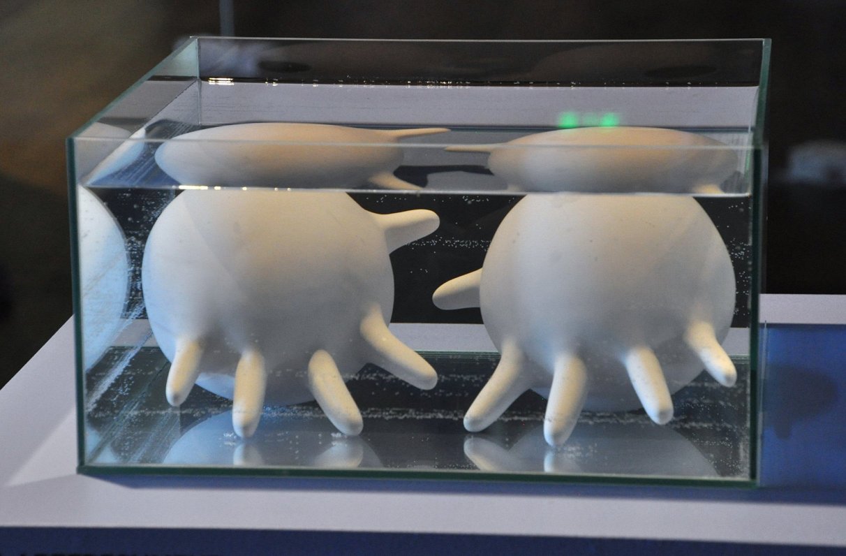 И вот — обширная «персоналка». Сама художница говорит, что выставка — это рассказ, и выделяет в нем ключевые слова: гидрофеминизм, экологический кризис, грибы с глазами («Мицелия» даром не прошла — LSM+), беременность, материнство (Сандра недавно стала мамой и встречала журналистов с малышом на руках — LSM+), искусственное оплодотворение и девять замороженных эмбрионов.