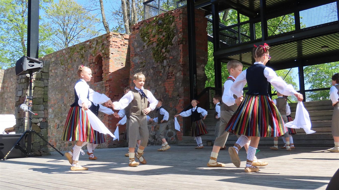 Полутора часами позже Илзе Мажане с командой сопровождающих приехала в развалины Гробиньского орденского замка. Здесь уже собрались коллективы Южнокурземского края, расписные «жемчужины» красовались на длинном столе. Снова были выступления, добрые слова и предвкушение праздника… От края на Праздник отправятся около 700 человек, это три десятка разных коллективов.
