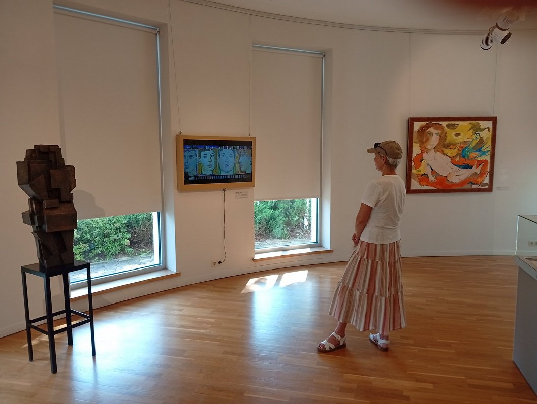 Выставка дополнена видеоэкраном, в котором можно лицезреть Джемму в киножурнале «Искусство» от 1967 года года. Сделав круг по каминному залу, вы обнаружите зеркало. Можете взглянуть в него — увидите свой автопортрет. Собственно, и экспозиция именуется «Джемма Скулме. Взгляд в зеркало», и название раскрывает способность творческой личности постоянно меняться.